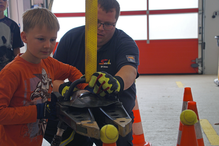 Drei Stationen waren für die Kinder rund um das Feuerwehrhaus aufgebaut worden. Die erste Station war dabei das Hilfeleistungslöschgruppenfahrzeug (HLF) der Ortsfeuerwehr Ilten. Hier wurde den Besuchern der „Allrounder“ der Feuerwehr vorgestellt, da dieses Fahrzeug umfangreiche Ausrüstung sowohl für die Brandbekämpfung als auch für die Technische Hilfeleistung bietet. Die Kinder lernten dabei auch die Handhabung mit dem hydraulischen Rettungsspreizer kennen: Unter Anleitung und mit Unterstützung eines ausgebildeten Feuerwehrkameraden hatte jeder die Möglichkeit, mit diesem technischen Gerät einen Tennisball von einem Verkehrsleitkegel aufzunehmen und auf einem anderen wieder abzusetzen.