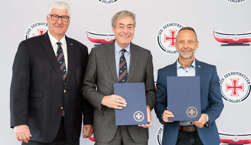 DGzRS-Vorsitzer Ingo Kramer (mi.) und sein Stellvertreter Lars Carstensen (li.) mit SET-Werftgeschäftsführer Olaf Deter (re.) bei der Vertragsunterzeichnung am 14. April 2026 in der Zentrale der Seenotretter in Bremen – Foto: Die Seenotretter – DGzRS