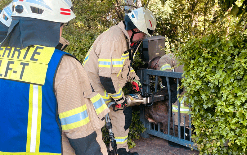 Vor Ort bestätigte sich die Lagemeldung: ein Rehbock steckte mit der Hüfte zwischen den Gitterstäben einer Metallpforte fest und war nicht mehr in der Lage, sich aus eigener Kraft wieder zu befreien. Nachdem das Tier mit einer Decke über den Kopf beruhigt werden konnte, wurden die Gitterstäbe mit einem hydraulischen Spreizer so weit auseinander gedrückt, dass das Tier schnell aus seiner misslichen Lage befreit werden konnte.