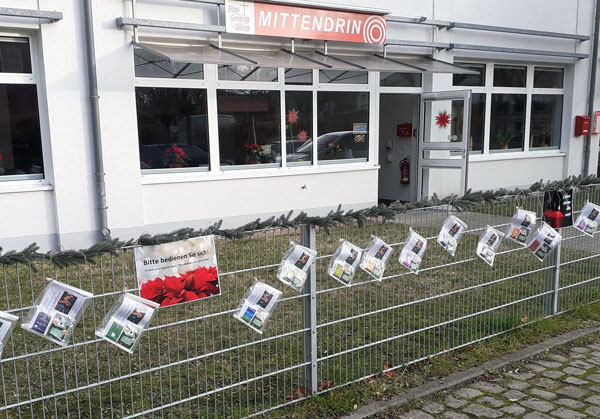 An jedem Adventssonntag und außerdem auch am Heiligabend dürfen sich Passanten am Zaun vor dem „Mittendrin“ in der Marggrafstraße bedienen und eine kleine Adventsüberraschung mit nach Hause nehmen. Ob Bastelmaterial, kleine Dekoteile, ein Gedankenanstoß oder etwas zum Genießen – alles soll ein bisschen Freude in die Herzen der Anwohner tragen.