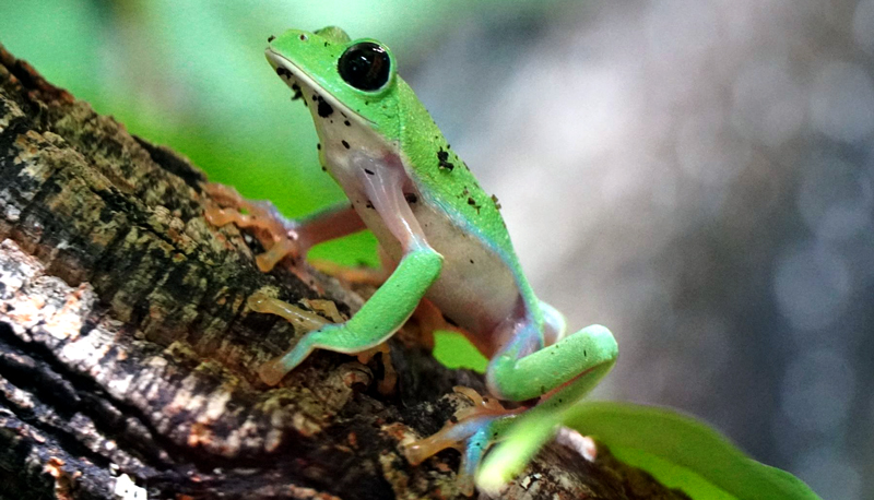 Der Neuzugang im Amphibium ist leuchtend grün, hat blaue Streifen an Beinen und Füßen und orangene Augen: Der Orangeaugen-Laubfrosch (Agalychnis annae) ist ein echter Hingucker. In der Artenwand des Amphibiums lässt sich der Lurch aus Costa Rica bestens beobachten – wenn man ihn erst gefunden hat. Zur Tarnung faltet sich der Frosch gerne zusammen und sieht dann aus wie ein grüner Stein. „Der Orangeaugen-Laubfrosch ist durch Lebensraumverlust und einen tödlichen Hautpilz bedroht, der nur Amphibien befällt“, erklärte Zoo-Geschäftsführer Casdorff, „der Erlebnis-Zoo will durch Zucht und Forschung dazu beitragen, diesen außergewöhnlichen Laubfrosch zu erhalten.“