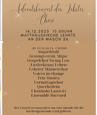Ein Höhepunkt ist am Sonntag um 15 Uhr das große Adventskonzert der Lehrter Chöre – dieses Mal wieder in der Matthäuskirche in der Straße An der Masch 26. Beteiligte Chöre sind von der Musikschule Ostkreis Sugar & Salt, der Gesangsverein Aligse, der Gospelchor Swing Low der Markusgemeinde Lehrte, der Gemischte Chor Liederkranz, der Lehrter Männerchor, Voices in Change, von der Neuen Liedertafel sind der Vormittagschor, Tria Musica und Querliedein, das Ensemble D´Accord und das ukrainische Ensemble Ukrainski Lastivky. Der Eintritt ist frei, um eine Spende zugunsten der Kirchengemeinde wird gebeten.