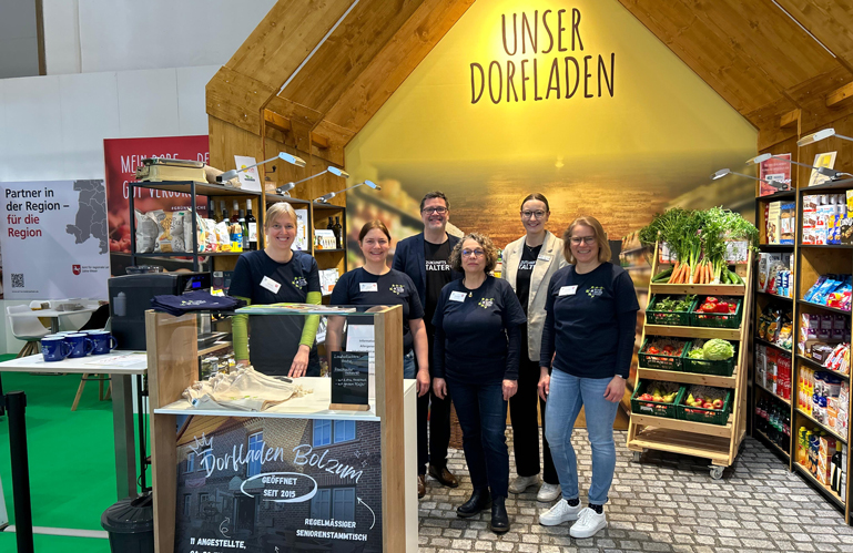 Der Messestand zeigt einen Musterdorfladen mit Grundnahrungslebensmitteln und einer breiten Palette an regionalen Produkten, die einen Dorfladen besonders auszeichnen. Zudem gibt es eine Café-Ecke, die auf die sozialen Funktionen der Dorfläden hinweist. Filme und Fotos vermitteln einen Eindruck von den teilnehmenden Dorfläden, allen voran der aus Bolzum.