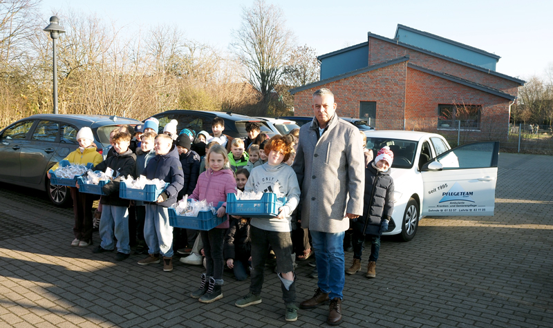 Gegen 11.30 Uhr war dazu dann Sven Grabbe als Vertreter vom Pflegeteam Sehnde zur Schule gekommen und wurde dort von allen dritten Klassen schon erwartet. Hier wechselten fünf große Kisten mit 74 Tüten frischer Kekse von stolzen Schülern den Besitzer, um den Senioren einen weihnachtlichen Gruß zu schicken – von Jung zu Alt.