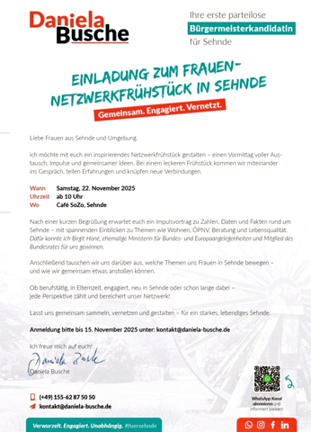 Mit einem Frühstück im Café Sozo in der Mittelstraße startete die parteilose Bürgermeisterkandidatin Daniela Busche am Sonnabend, 22. November 2025, das neue Netzwerkformat „Starke Frauen – starker Kaffee“. Ziel des Treffens war es, engagierte Frauen aus Sehnde zusammenzubringen – überparteilich, offen und im Austausch auf Augenhöhe.
