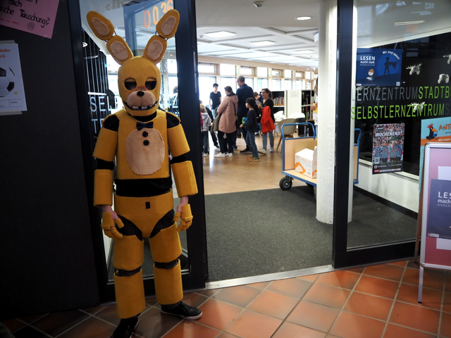 Neben dem „üblichen“ Besuch der Angebote gab es auch eine „KGS-Rallye“. Dazu empfing man in der Schulstraße eine Stempelkarte, die beim Besuch auf den verschiedenen Stationen abgestempelt wurde und für die man dann ein „Schreibgerät der KGS“ bekam, wie es die organisierenden Schüler darstellten. Vor der Bibliothek stand dann zudem ein besonderer „Eye Catcher“: Aaron Zelenauskaite mit selbst gebastelten Kostümen lockte die Gäste in die „Räume der Bücher“. Zu diesem Hobby, so sagte er, sei er durch die Maskenbildnerei beim Darstellenden Spiel gekommen.