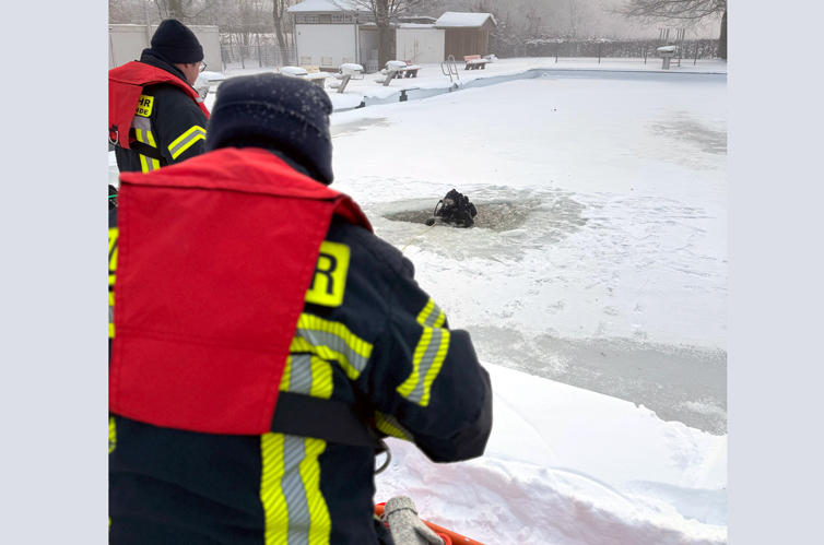 Temperaturen um minus zehn Grad und eine geschlossene Eisdecke boten am Sonntag, 11. Januar, ideale – wenn auch äußerst anspruchsvolle – Bedingungen für einen besonderen Übungsdienst der Tauchergruppe der Feuerwehr Sehnde: Im Waldbad Sehnde trainierten die Taucher gemeinsam mit Kameraden der Ortsfeuerwehr Sehnde intensiv die Rettung von Personen aus eisbedeckten Gewässern. Denn immer wieder betreten Personen unvorsichtig die viel zu dünne Eisdecke von Gewässern, brechen ein und geraten dann in Lebensgefahr. Um darauf vorbereitet zu sein, opferten einmal mehr die ehrenamtlichen Angehörigen der Feuerwehr ihre Freizeit.