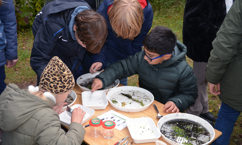 Es war erstaunlich, was die Kinder im Wasser alles entdeckten. Ein Gelbrandkäfer beeindruckte mit seiner stattlichen Größe von rund drei Zentimetern. Und um auf die Frage „Kann der beißen?“ einzugehen: Ja, das schwimmende Insekt lebt räuberisch und kann auch zubeißen, wenn es sich bedroht fühlt. Ein respektvoller Umgang ersparte den jungen Forschern aber diese Erfahrung. Auch Wasserskorpione, die in Wirklichkeit zu den Wanzen gehören, beförderten die eifrigen Viertklässler ans Licht, ebenso zahlreiche Muscheln, Schnecken und Stichlinge – also sogar kleine Fische.